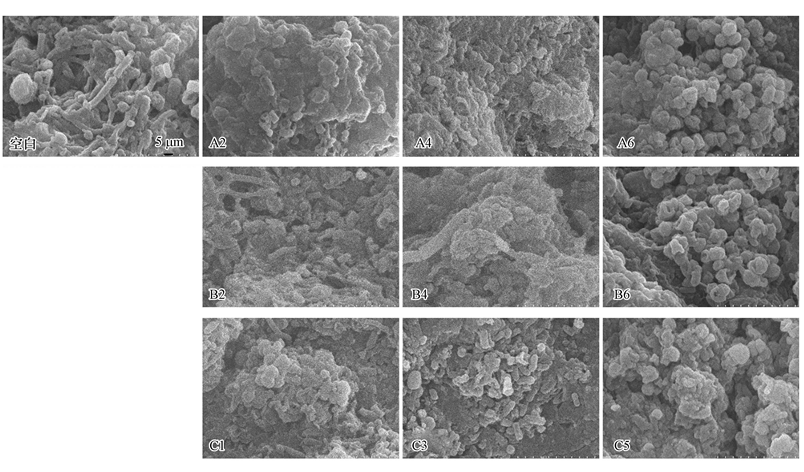 根據(jù)3.1節(jié)中的COD去除率變化選擇具有代表性的濃度組(A組:A2、A4、A6;B組:B2、B4、B6;C組:C1、C3、C5)進行各項指標(biāo)的測定.圖 2為放大10000倍后的顆粒污泥的掃描電鏡圖.由圖 2可見,空白組厭氧顆粒污泥表面幾乎為8~25 μm長的桿狀菌,伴隨有少量的球菌,污泥表面凹凸不平孔隙交錯,是內(nèi)部微生物能量代謝的重要通道.在高濃度的亞硝氮、硝氮和氨氮(A6、B6和C5)作用下,厭氧顆粒污泥的表面結(jié)構(gòu)都發(fā)生明顯變化,污泥表面的主要細(xì)菌由桿狀菌變?yōu)榍驙罹瑤缀醪灰姉U菌.低濃度抑制作用下,污泥表面主要細(xì)菌為桿菌和球狀菌,且與空白組相比桿菌比例明顯降低.