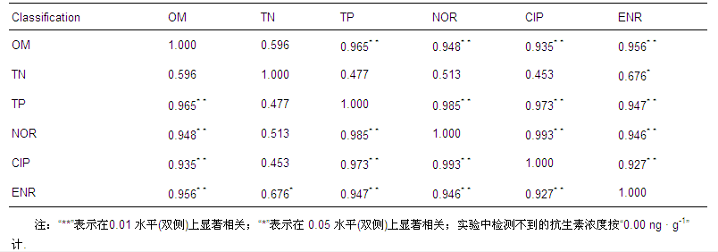 對FQs與沉積物性質(zhì)進(jìn)行Person相關(guān)性分析(表 1),NOR與OM、TP相關(guān)性極顯著,相關(guān)系數(shù)(r)分別為0.948、0.985(p<0.01);CIP與OM、TP相關(guān)性極顯著,r分別為0.935、0.973(p<0.01);ENR與OM、TP相關(guān)性極顯著,r分別為0.956、0.947(p<0.01),與TN相關(guān)性顯著,r為0.676(p<0.05).NOR、CIP與ENR之間相關(guān)性極顯著,r最小為0.927(p<0.01).