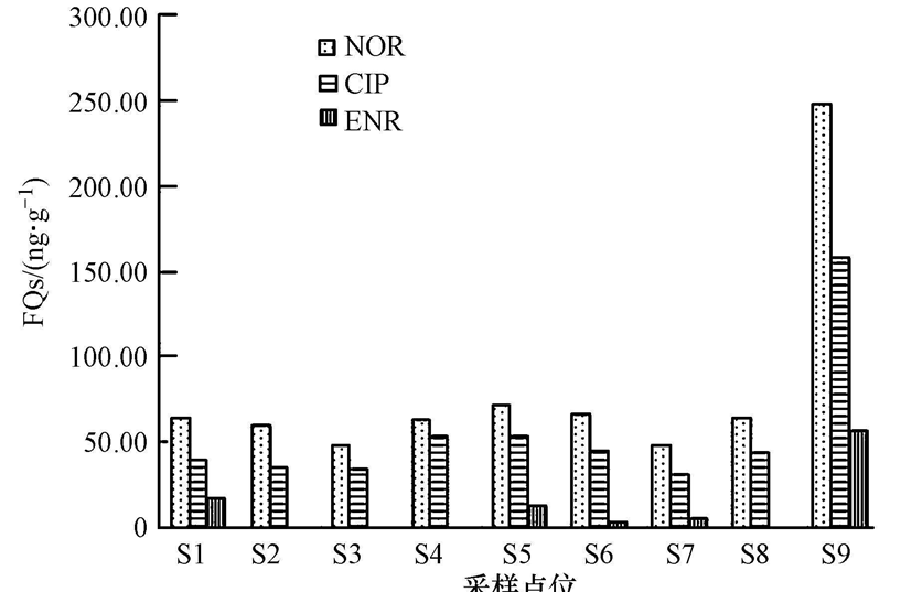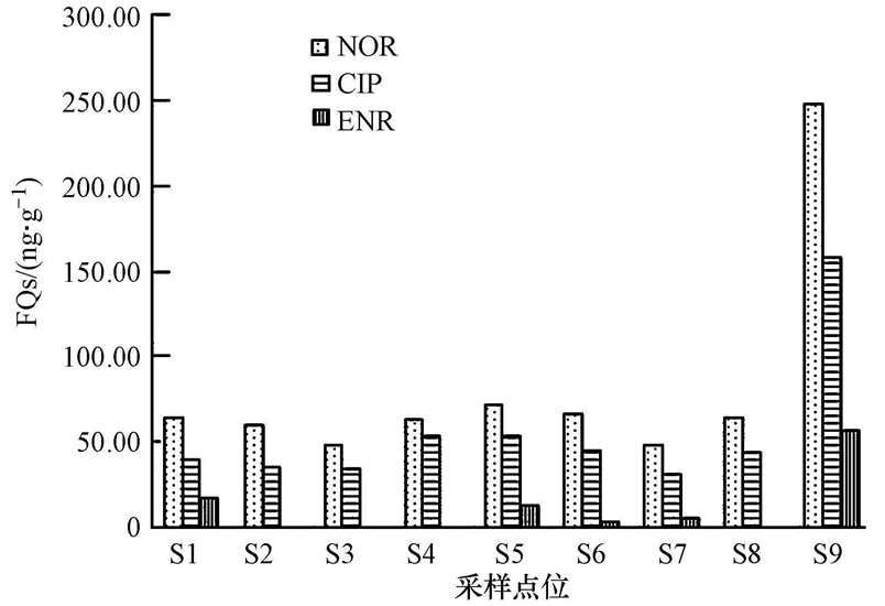 從圖 1可見,9個(gè)采樣點(diǎn)均可檢測到NOR和CIP,S2、S3、S4、S8均未檢測到ENR.各樣點(diǎn)FQs含量均為NOR>CIP>ENR.S9的FQs含量最高,NOR含量最高為248.25 ng · g-1,CIP最高為158.69 ng · g-1,ENR最高為56.81 ng · g-1.