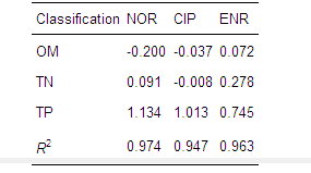 對NOR、CIP及NOR含量與OM、TN、TP進(jìn)行多元線性回歸分析(見表 2),sig均小于0.001,R2在0.947~0.974間,回歸方程有效,回歸模型與實(shí)驗(yàn)得到的數(shù)據(jù)均吻合較好.從多元回歸分析中得出NOR、CIP及NOR含量主要取決于TP的含量(表 2).