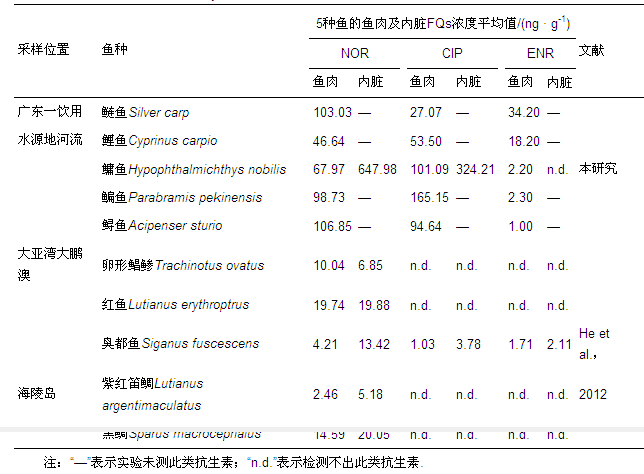 本研究測得5種魚的魚肉中的FQs含量均顯著高于大亞灣大鵬澳和海陵島中魚的FQs的含量;部分魚類魚肉和內(nèi)臟中NOR、CIP含量高于美國、歐盟的許多國家的殘留標(biāo)準(zhǔn)(殘留限量為30 ng · g-1),也高于我國農(nóng)業(yè)部標(biāo)準(zhǔn)NY 5070—2001《無公害食品水產(chǎn)品中漁藥殘留限量》的殘留標(biāo)準(zhǔn)(NOR、CIP殘留限量為50 ng · g-1).分析原因乃為同上,主要是養(yǎng)殖魚塘、禽畜養(yǎng)殖業(yè)、城鎮(zhèn)生活污水及感潮河流的滯留效應(yīng),導(dǎo)致面源污染嚴(yán)重,水體中可能含有較高的FQs含量.Li的研究表明FQs在可食用的軟體動(dòng)物內(nèi)臟中性質(zhì)穩(wěn)定(Li et al., 2012);孫言春的研究也表明FQs在魚體內(nèi)吸收較快,消除較慢,F(xiàn)Qs在魚體內(nèi)富集作用較強(qiáng).魚內(nèi)臟部位為代謝器官,因此,更易積累,造成魚內(nèi)臟中抗生素含量較高的現(xiàn)象.魚體內(nèi)臟中FQs含量多數(shù)情況下高于魚肉中FQs含量,這個(gè)結(jié)果與He的研究結(jié)果一致.