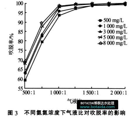 由圖3 可知,氣液比小于1 000∶1 時,不同氨氮濃度廢水的吹脫率均隨氣液比的增加顯著提高;但氣液比達到1 000∶1 時, 氨氮質(zhì)量濃度≥3 000 mg/L以上的廢水吹脫率可達95%以上; 繼續(xù)提高氣液比,吹脫率增加緩慢;而氨氮質(zhì)量濃度<3 000 mg/L的廢水吹脫率接近95%,繼續(xù)提高氣液比至1 500∶1后,吹脫率可達95%以上且增加緩慢。這表明,氣液比超過1 000∶1 后, 進水氨氮濃度對吹脫率影響不大。實驗中為獲得95%以上的吹脫率,應(yīng)根據(jù)進水氨氮濃度將氣液比控制在(1 000~2 000)∶1 的范圍。