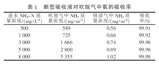 由表1 可知, 新型吸收液可高效去除不同氨氮濃度廢水吹脫氣中的氨,去除率達99.9%以上,吸收后排放氣中的氨質(zhì)量濃度最高為1 mg/m3 左右,全能滿足《惡臭污染物排放標準》(GB 14554—1993)中氨排放標準。