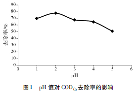 控制其他反應(yīng)條件不變,鐵炭質(zhì)量比為1∶3,氯化鈉投加量為200 mg/L,攪拌時(shí)間為30 min,在不同的pH值(1、2、3、4、5) 下進(jìn)行反應(yīng)。測定各水樣的CODCr值,計(jì)算CODCr去除率,結(jié)果見圖1。