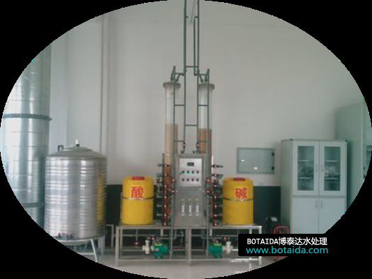 混床是指水依次通過裝有氫型陽離子交換樹脂的陽床和裝有氫氧型陰子交換樹脂的陰床的系統(tǒng)。氫型陽交換床用于除去水中的陽離子;氫氧型陰交換床用于除去水中的陰離子。通過復(fù)床可將水中的種礦物鹽基本除去。為了獲取較好的除鹽效果,陽床內(nèi)裝載強酸陽離子交換樹脂,陰床一般內(nèi)裝載強堿陰離子交換樹脂。混床也分為體內(nèi)同步再生式混床和體外再生式混床。