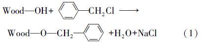 參照文獻(xiàn)(王東華等,2000)方法,在帶有攪拌機、溫度計和回流裝置的250 mL三口燒瓶中,加入20.0 g脫脂杉木粉和10% NaOH水溶液80~120 mL,攪拌均勻后讓其潤脹 30 min,然后加入 80~120 mL氯化芐和80 mL甲苯,攪拌下于110 ℃ 油浴中加熱反應(yīng)到設(shè)定時間,冷卻并加入少量水,抽濾,分別用50 mL 50%乙醇洗滌兩次,100 mL水洗滌兩次,再用50 mL 95%乙醇洗滌兩次,抽干,在60 ℃下干燥至恒重,得芐基化杉木粉,簡稱“芐基化木粉”,轉(zhuǎn)入干燥器中,并計算增重百分率(WPG).木粉芐基化改性的化學(xué)反應(yīng)式如下: