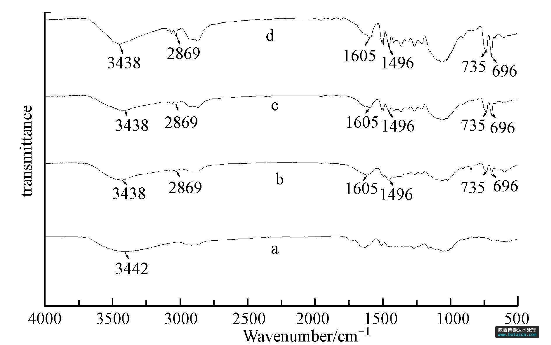 分析 采用Nicolet Avatar-330紅外光譜儀對脫脂木粉、芐基化木粉、多微孔芐基化木粉和吸附后的多微孔芐基化木粉進行了表征(圖 1).對比原木粉(圖 1a)和芐基化木粉(圖 1b)的紅外光譜圖發(fā)現(xiàn),原木粉經(jīng)芐基化改性后,羥基振動吸收峰由3442 cm-1移向3438 cm-1,在1605 cm-1、1496 cm-1處的兩重峰及735 cm-1、696 cm-1處的強吸收峰均顯示單取代苯環(huán)的特征吸收.另外,2868 cm-1處出現(xiàn)的振動吸收峰表明了木材中的部分羥基已經(jīng)被芐基所取代.對比芐基化木粉(圖 1b)和多微孔芐基化木粉(圖 1c)的紅外光譜圖發(fā)現(xiàn),圖譜形態(tài)變化不大,無新的官能團吸收峰出現(xiàn),表明芐基化木粉經(jīng)水熱處理后,木粉的化學(xué)組成沒有發(fā)生明顯變化.對比多微孔芐基化木粉(圖 1c)與吸附后的多微孔芐基化木粉(圖 1d)的紅外光譜圖,發(fā)現(xiàn)其吸收峰的波數(shù)基本一致,表明吸附對木粉的化學(xué)組成沒有產(chǎn)生明顯影響.