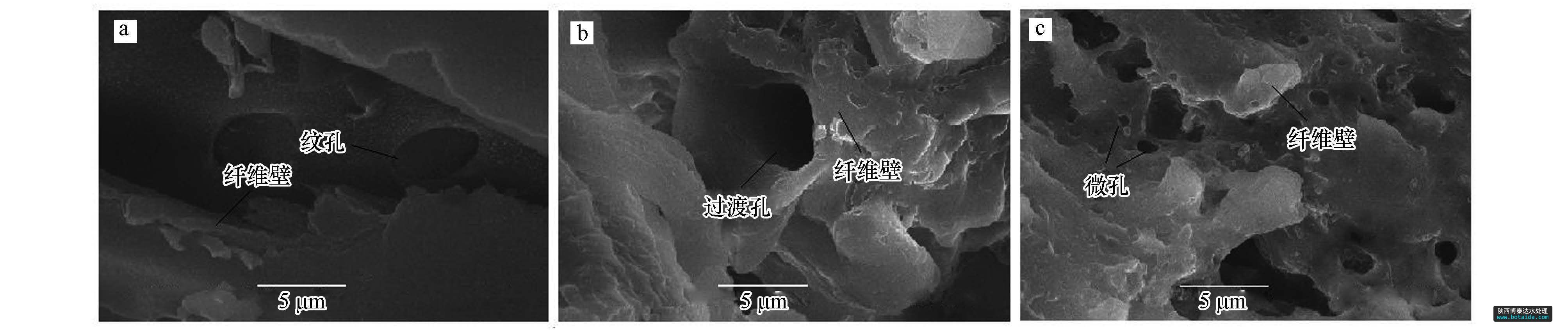 用JSM-6380LV掃描電鏡對原木粉、芐基化木粉、多微孔芐基化木粉進行了分析(圖 4).對比原木粉(圖 4a)和芐基化木粉(圖 4b)發(fā)現(xiàn),原木粉中封閉的紋孔清晰可見,纖維壁堅硬、平整.原木粉經(jīng)芐基化改性后(圖 4b),紋孔膜破裂,纖維壁膨松、柔軟,過渡孔清晰可見.芐基化木粉經(jīng)水熱處理后得到多微孔芐基化木粉(圖 4c),纖維壁明顯破裂,產(chǎn)生了許多微孔.這一方面是由于水蒸汽分子具有高能量、高穿透力,可將芐基化木粉纖維壁上的微纖絲部分沖破,并造成斷裂,產(chǎn)生新的微孔或超微孔(王瑀,2008);另一方面,在高熱水蒸汽分子沖擊下,芐基化木粉結(jié)晶區(qū)中纖維素的氫鍵斷裂,纖維分子從彎曲狀態(tài)變成伸展?fàn)顟B(tài),纖維壁伸展開來,產(chǎn)生了明顯的“膨化效應(yīng)”,有效地擴大了芐基化木粉的過渡孔和微孔.此外,水熱處理中所加乳化劑OP-10能迅速乳化從纖維壁間釋放出的膠狀物質(zhì),有利于及時清洗疏通孔道.由此可見,木粉經(jīng)芐基化及水熱處理后,木材纖維壁變得膨松,產(chǎn)生大量的微孔或超微孔,有效地擴大了芐基化木粉吸附重金屬離子的比表面積,同時使纖維素和半纖維素分子上的羥基更加裸露,增加了對重金屬離子絡(luò)合的羥基數(shù)目,從而提高了對重金屬離子的吸附性能.