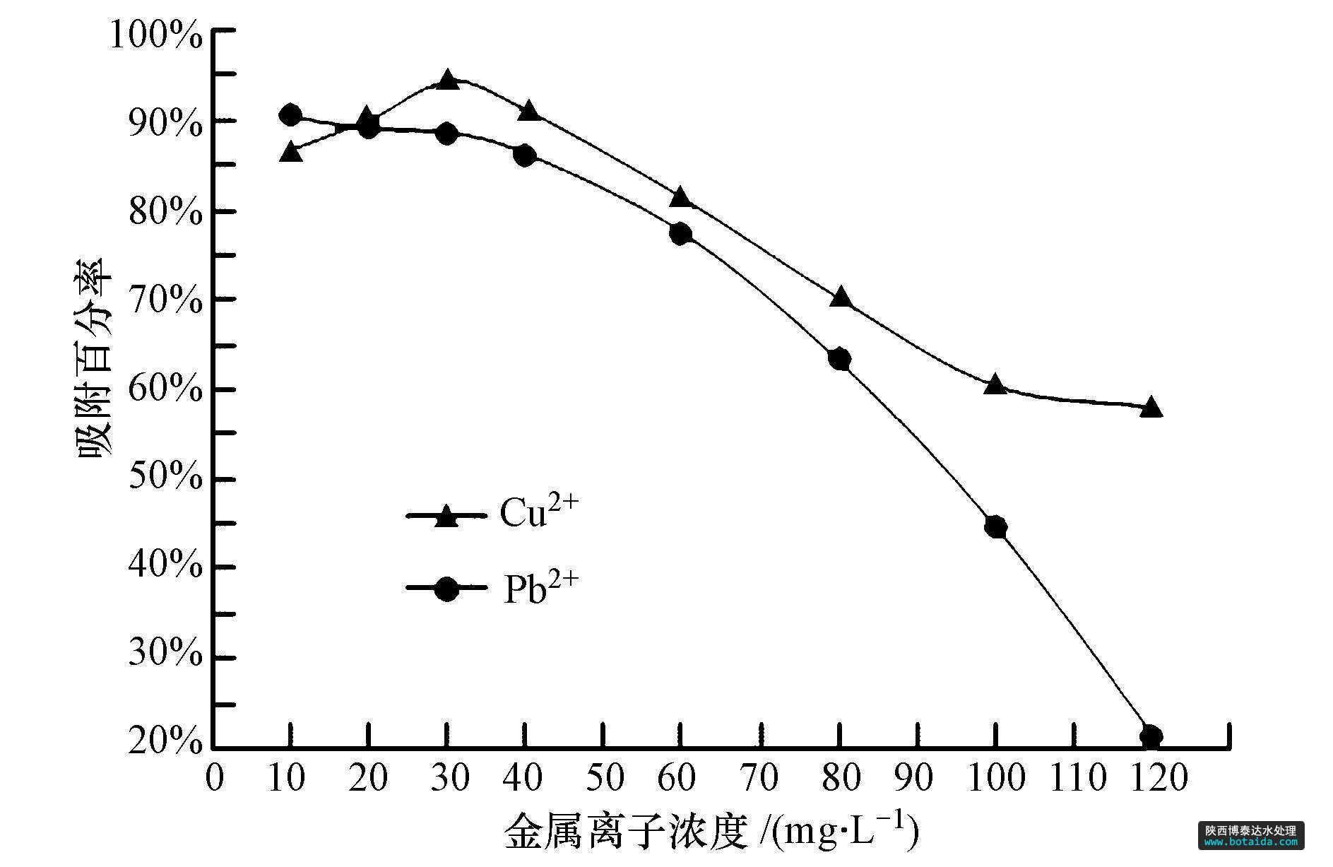 在16個100 mL錐形瓶中,分別加入0.500 g多微孔芐基化木粉(增重率35.5%),依次加入10、20、30、40、60、80、100、120 mg · L-1不同離子濃度的溶液25 mL,控制水溫為40 ℃,比較不同濃度的Cu2+和Pb2+溶液在60 min內(nèi)對吸附百分率的影響(圖 9).結(jié)果表明:①隨著溶液中金屬離子濃度的增加,多微孔芐基化木粉對Cu2+的吸附百分率呈現(xiàn)出先增加后下降的趨勢,而對Pb2+的吸附百分率一直呈現(xiàn)緩慢下降趨勢.②當(dāng)Cu2+溶液初始濃度為30 mg · L-1時,多微孔芐基化木粉對Cu2+溶液的吸附百分率最高,為94.4%;當(dāng)Pb2+溶液的初始濃度為10 mg · L-1時,多微孔芐基化木粉對Pb2+溶液的吸附百分率最高,達(dá)90.7%.這也反映出在有限的吸附時間內(nèi),多微孔芐基化木粉對Pb2+的吸附較慢,因而達(dá)到吸附平衡的時間要比Cu2+更長.