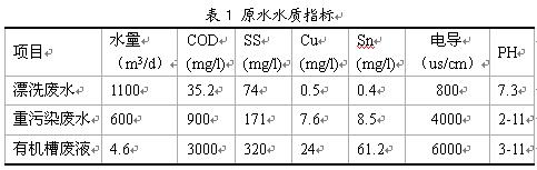 某電子公司是國內重點集成電路封裝測試企業(yè),該公司主要從事半導體集成電路、半導體元器件的封裝測試業(yè)務,其生產線廢水主要包括兩部分,一部分為晶元的減薄劃片廢水、另一部分為電鍍錫化廢水。減薄劃片廢水中主要含有大量的硅粉微粒,SS約2000mg/L左右,特性很穩(wěn)定,不易沉降,電導率僅為2-4µs/cm,東洋采用自主研發(fā)的二級連續(xù)UF膜系統(tǒng)進行進行廢水回收利用,廢水回收利用率≥90%,回收水質好,同時回收硅粉。在此主要介紹電鍍錫化廢水的回用處理系統(tǒng);廢水中主要含有Cu、Sn、酸堿、有機物等,在該項目中首先要做好分質分流是尤為重要,把錫化電鍍線上的廢水按照水中的成份及濃度來分質收集,主要分為漂洗廢水、重污染廢水、有機槽廢液三路,水質如下: