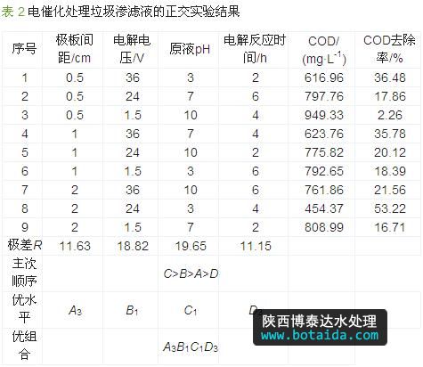 分析表 2發(fā)現(xiàn),原液pH對降解效果的影響最顯著,其次是電解電壓;各因素對電催化反應(yīng)的影響順序?yàn)椋涸簆H>電解電壓>極板間距>電催化氧化時間。