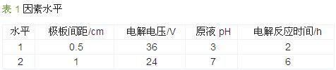 設(shè)計(jì)極板間距(A)、電解電壓(B)、原液pH(C)和電解反應(yīng)時間(D)4因素3水平L9 (34)正交實(shí)驗(yàn)表,如表 1所示,實(shí)驗(yàn)結(jié)果列于表 2。