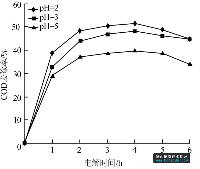 綜上不難發(fā)現(xiàn),當(dāng)滲濾液的pH分別為2、3、5 時,隨電解時間的延長,COD去除率進(jìn)一步增加,但超過4 h后去除率基本不變;當(dāng)電解電壓為24、36 V,電解4 h時,COD去除率達(dá)到最大;極板間距為1.5 cm時,電解約4 h COD去除率也達(dá)到最大值。這說明采用Ir-Ta-Sn摻雜電極對垃圾滲濾液進(jìn)行電催化降解時,電解時間不宜超過4 h,此時COD去除率已達(dá)到最大值;電解時間繼續(xù)延長,垃圾滲濾液中的COD不但不降低,反而會有一定程度的回升。因此合理控制電化學(xué)氧化時間,可以減少能耗,并提高COD去除率。