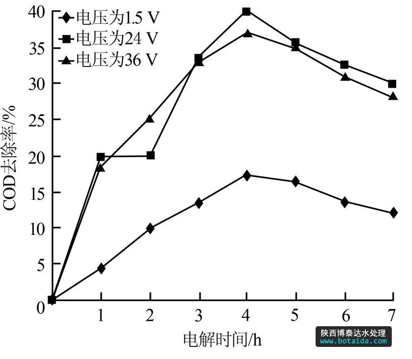 (2)當(dāng)電催化氧化時間達(dá)到約4h時,對垃圾滲濾液的COD去除率基本達(dá)到最大;當(dāng)電解電壓為24 V或36 V時,電催化氧化對COD的去除效果有明顯提高。