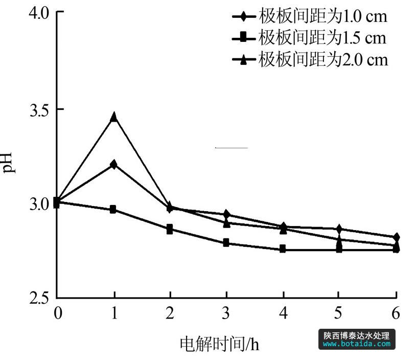 考慮到過高的電解電壓對電催化降解的影響不是很顯著,且由正交實(shí)驗(yàn)結(jié)果可知,電解電壓為24 V、pH為3時COD去除率最高,因此調(diào)整電解電壓為24 V、垃圾滲濾液pH為3,分別設(shè)置極板間距為1.0、1.5、2.0 cm進(jìn)行電催化降解實(shí)驗(yàn),每隔1 h取1次水樣,電解過程中COD去除率及pH變化情況如圖 5、圖 6所示。