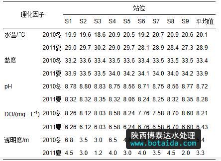 水溫、鹽度、電導(dǎo)率、溶解氧(DO)、pH值等理化因子通過采用美國YSI-561多參數(shù)水質(zhì)分析儀進行現(xiàn)場測定,透明度用薩氏盤測定.