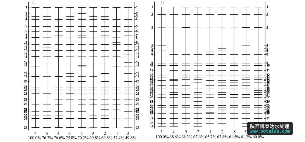 圖3 大亞灣海域浮游細菌16S rDNA V3區(qū)DGGE圖譜分析帶型圖(其中水平軸上的數(shù)字(1~9)為站點編號,百分比是與標(biāo)準(zhǔn)泳道的匹配度; 垂直軸上的數(shù)字為DNA條帶編號(a. 2010年冬,b. 2011年夏))