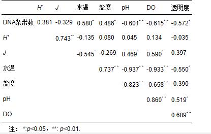 從浮游細菌與環(huán)境因子之間的相關(guān)關(guān)系可以看出,DNA指紋條帶數(shù)與環(huán)境因子密切相關(guān),其中與溫度和鹽度明顯正相關(guān)(p<0.05),而與pH、DO以及透明度明顯負(fù)相關(guān)(p<0.05或p<0.01),結(jié)果說明高溫高鹽可促進浮游細菌多樣性,而pH、DO、透明度下降等水質(zhì)惡化現(xiàn)象則可降低浮游細菌的種類豐富程度.H′值僅與J值呈明顯正相關(guān);而J則與水溫明顯負(fù)相關(guān),與pH和DO明顯正相關(guān).各種環(huán)境因子之間幾乎均呈現(xiàn)出明顯的相關(guān)關(guān)系,其中水溫與pH、DO、透明度均明顯負(fù)相關(guān)(p<0.05或p<0.01),說明夏季水質(zhì)較冬季差;而DO又與pH和透明度明顯正相關(guān)(p<0.01).