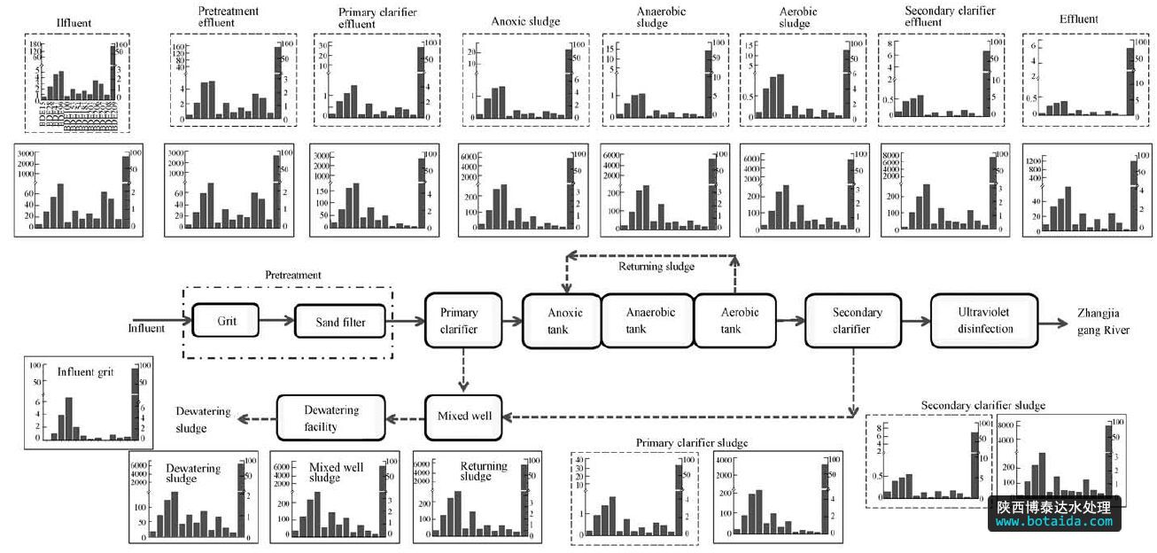 2012年4月份則采集了該廠各個構(gòu)筑物的出水和污泥樣品,采樣點和類型見圖 1.我們在14: 00—17: 00之間,每個小時分別采集該構(gòu)筑物的污水和污泥樣品,然后分別將污水和污泥樣品混合在一起作為一個混合樣.污水和污泥樣品是分別用干凈的棕色玻璃瓶和廣口瓶采集的,每個采集瓶上方不留空間,采集完之后立馬放入冰袋中,并運到實驗室保存.
