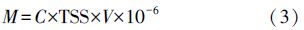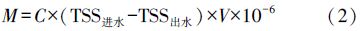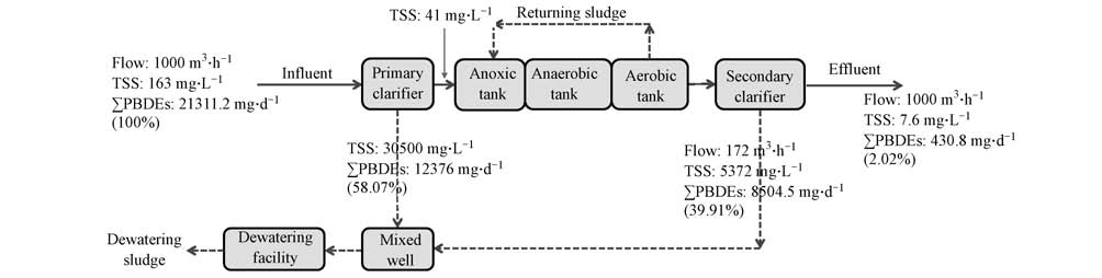 式中,M是各構(gòu)筑物污水或污泥的PBDEs日均負(fù)荷量(mg · d-1);C是各構(gòu)筑物污水或污泥中PBDEs的濃度(ng · L-1,ng · g-1);V是污水的日均流量(m3 · d-1);TSS是污水中總懸浮顆粒物濃度(mg · L-1).