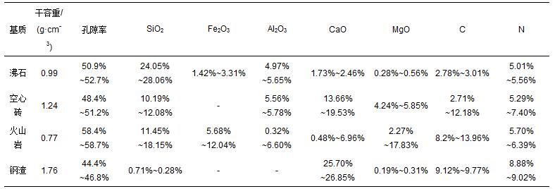 沸石、火山巖購于北京某濾料廠,沸石粒徑2~5 mm,火山巖粒徑2~10 mm.空心磚來自北京某工地,鋼渣來自南昌某鋼廠,研磨過篩后粒徑為2~5 mm.各填料均用清水清洗,并烘干備用.填料干容重與孔隙率采用標準土壤學方法測定.填料的化學組成采用X射線能譜儀測定(EX-250,HORIBA公司,日本).4種填料的理化性質如表 1所示.