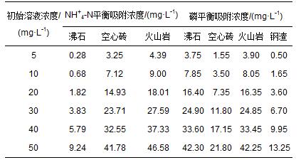 單種填料對溶液中氮、磷的等溫吸附結果見表 3.由于鋼渣在前期實驗中對NH+4-N基本無吸附,故未在表中列出.如表 3所示,填料的類型影響填料的吸附效果.隨著溶液濃度增加,填料的吸附量也迅速增大,但當濃度增大到一定程度后,吸附作用逐漸減弱,吸附作用趨于平衡.