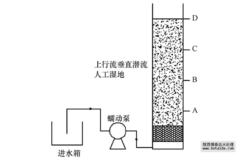 試驗裝置模擬上行流垂直潛流人工濕地,裝置直徑15 cm,高100 cm,填料層高度80 cm,底部填充10 cm厚的礫石為布水區(qū)(圖 1).填料柱采用蠕動泵進水,進水以松花江富錦段微污染江水水質為依據配水,水質為COD 80~100 mg · L-1,NH+4-N 10~13 mg · L-1,NO-3-N 13~15 mg · L-1,TP 1.5~2.5 mg · L-1.水力負荷為2.65 mL · min-1,運行時間為20周.系統(tǒng)穩(wěn)定運行后,對填料層的不同深度進行分析,考察不同填料段污染物在濕地中去除的規(guī)律,在填料20、40、60、80 cm處分別設置取樣口,編號分別為A(0~20 cm)、B(20~40 cm)、C(40~60 cm)、D(60~80 cm).