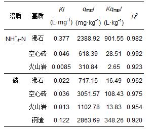 Langmuir等溫吸附模型中的K值為吸附結合能,K值越大,表示填料與溶質的結合越穩(wěn)定.從表 4可以看出,各填料與NH+4-N之間的結合能大小順序為沸石>空心磚>火山巖;各填料與磷之間的結合能大小順序為鋼渣>空心磚>沸石>火山巖.Kqmax為最大緩沖容量,反映固液體系吸附溶質時的緩沖能力(趙桂瑜,2007).將各填料進行比較,對NH+4-N緩沖容量最大的填料為沸石,對磷緩沖容量最大的為鋼渣,空心磚次之.這說明即使溶液污染物濃度變化較大時,這些填料對相應污染物仍能維持較好的去除效果.因此,沸石是較好凈化NH+4-N,鋼渣、空心磚是較好的凈化磷的人工濕地填料.