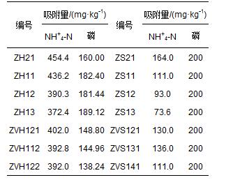 根據上述實驗結果,綜合考慮各填料吸附能力及其性質的差異,進行不同填料組合方式的優(yōu)化配比.不同填料組合方式對氮、磷48 h的吸附量如表 5所示.由表可知,不同填料組合方式對NH+4-N的吸附效果不同.對NH+4-N吸附效果最好的為沸石與空心磚的ZH組合,沸石、空心磚與火山巖的ZVH組合次之,7種填料組合方式的吸附量均在370 mg · kg-1以上,最高吸附量達到了454.4 mg · kg-1.7種填料組合方式對NH+4-N去除效果的排序為ZH21 > ZH11> ZVH121> ZVH112 > ZVH122> ZH12> ZH13.通過對各填料組分干容重及在填料組合中所占比例的計算可知,在不同填料組合方式中,沸石含量較高的填料組合方式對NH+4-N的吸附量較高.填料中含有鋼渣的ZS與ZVS的組合方式對NH+4-N的吸附效果較差,吸附量遠低于無鋼渣組合,均在170 mg · kg-1以下.由此可知,鋼渣的存在對沸石吸附NH+4-N產生了一定的抑制作用,這可能是由于鋼渣的特性導致的.