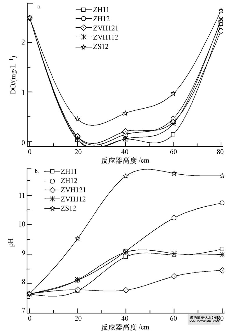 運行穩(wěn)定后,反應器中不同填料段DO與pH的變化如圖 2所示.DO在各反應器分布趨勢基本相似,在各段的數值上存在差異.DO在不同填料段的濃度具有明顯的空間特征,導致反應器在不同段形成了厭氧、缺氧、好氧交替的環(huán)境,這對微生物的生物降解、硝化、反硝化作用具有較大的影響.在各反應器底部20 cm處DO濃度均在0.5 mg · L-1以下,ZH11、ZH12、ZVH112、ZVH121的填料組合方式中,底部DO濃度達到了0.2mg · L-1以下.這說明當污水進入反應器后,DO被迅速消耗,在各反應器0~40 cm間形成了一個厭氧環(huán)境.同時隨著反應器高度的增加,反應器中DO濃度有所升高,在反應器頂端接觸空氣處達到最大值,各反應器頂部80 cm處的DO濃度維持在2.24~2.65 mg · L-1之間,這是由于大氣復氧導致DO濃度的升高.同時,由于該處污水可生化性已經較差,污染物不再耗氧分解.