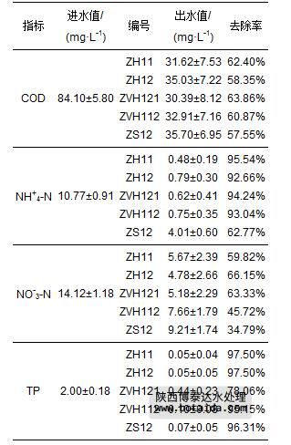總結分析各填料組合方式對污染物的去除效果,效果最好的填料組合方式為ZH11,其對COD、NH+4-N、NO-3-N、TP的去除率分別達到62.40%、95.54%、59.82%和97.50%.