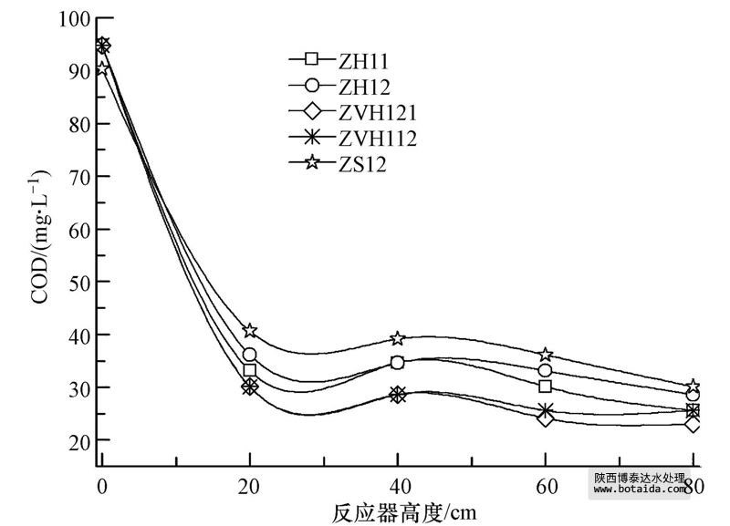 圖 3為運行穩(wěn)定后,不同反應器中COD沿豎直方向上的變化情況,在0~20 cm間,COD迅速下降,在20~80 cm間,COD則無顯著降低.COD沿反應器豎直方向的變化與DO的變化相比較,說明污水在進入反應器后,DO被好氧微生物迅速利用用于COD的降解.而在大部分有機物被降解后,COD較低,同時因為生物量、pH等的影響,在反應器頂部COD很難被進一步降解.有研究人員在反應器頂部加入曝氣裝置,其COD去除率要高于無曝氣反應器(Ong et al., 2010).由于本研究進水中COD偏低,且出水濃度也較低,為節(jié)約能耗,無需加入曝氣裝置.但遇到人工濕地處理高COD污水時,可在人工濕地中加入曝氣裝置,利于有機物更好地去除.