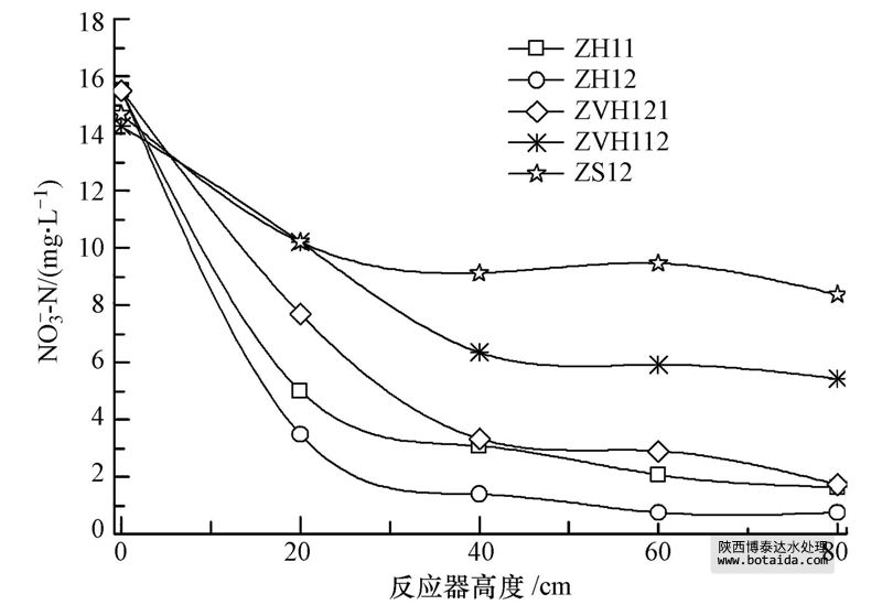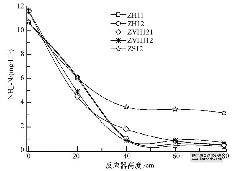 反應器中NH+4-N的去除有兩種途徑:第一,通過反應器中填料的吸附去除;第二,通過微生物的同化、硝化等作用被微生物自身利用或轉化為NO-3-N和NO-2-N(Ahn,2006).人工濕地運行前期NH+4-N主要通過填料吸附,但通過一段時間的運行后,微生物起到了主要去除NH+4-N的作用.圖 4展示了NH+4-N在反應器豎直方向上的變化,除含鋼渣的填料組合外,其它組合變化規(guī)律相似,在0~40 cm去除NH+4-N較多,說明各反應器在此段的生物量較為豐富,除基質吸附的部分外,一部分的NH+4-N通過微生物作用得到去除.而含鋼渣的ZS12組合由于pH在40 cm迅速的升高,不僅對微生物產生巨大影響,并且導致溶液中平衡NH+4+OH-NH3·H2O向右移動,填料對NH+4-N的吸附效果降低,影響NH+4-N的總體去除效果.武俊梅等(2010)對多種填料進行了實驗,發(fā)現沸石對NH+4-N的去除效果顯著高于其它填料,而鋼渣會使溶液pH上升,對NH+4-N去除效果較差.含有空心磚的組合由于pH沿反應器豎直方向上升的較為緩慢,大部分的NH+4-N在反應器底部已經得到有效的去除,pH在反應器頂部的升高并不會影響NH+4-N的出水濃度.
