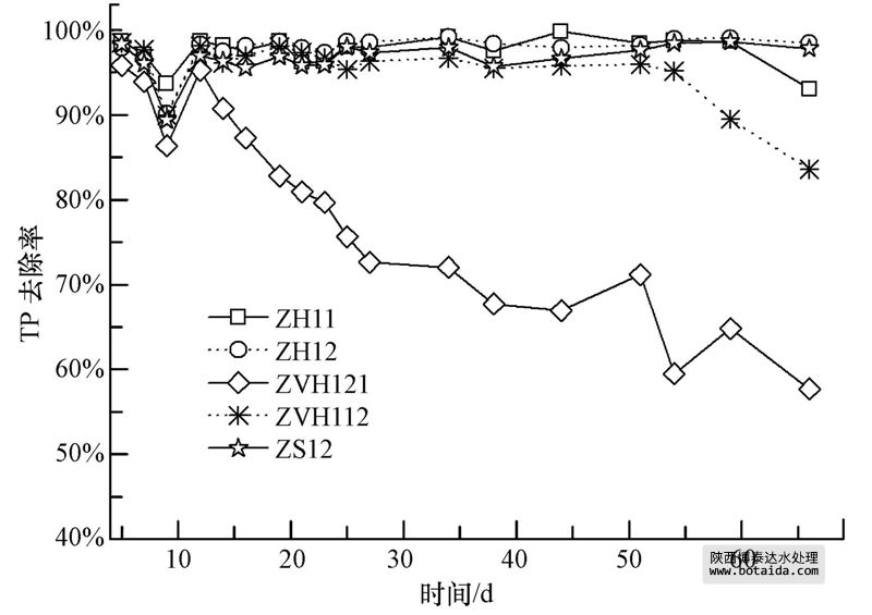 圖 6展示了反應器運行前70 d,各反應器中TP去除率的情況.ZH12、ZH11、ZS12填料組合對磷一直保持著較高的去除率,而ZVH121、ZVH112填料組合在運行期間磷去除率的降低,是因為在該組合中空心磚含量較少,在反應器運行一段時間后,反應器中的空心磚對磷吸附達到飽和.含鋼渣的ZS12組合對磷的去除效果穩(wěn)定且較高,但相比較于其他污染物的去除,鋼渣并不適于在人工濕地處理含磷較低廢水的工程中應用.而空心磚不僅能有效地去除磷,且對氮的去除無明顯負作用,適合添加到填料組合中,在不影響其它污染物去除效果的同時,用于提高人工濕地中磷的去除效果.