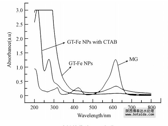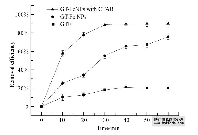 圖 5 GTE、GTE合成Fe NPs和CTAB存在時(shí)GTE合成的Fe NPs 對(duì)MG的去除