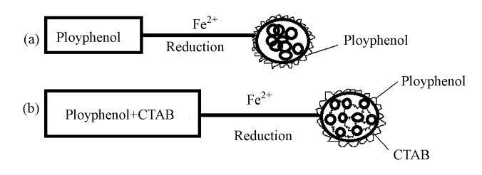用植物提取液合成納米金屬主要是通過(guò)植物提取液中的有機(jī)成分如多酚等為還原劑還原金屬鹽,GTE中多酚可作為還原劑還原亞鐵鹽制備Fe NPs(Njagi et al., 2011; Shahwan et al., 2011; Kharissova et al., 2013; Mittal et al., 2013). GTE合成Fe NPs和CTAB作用下GTE合成Fe NPs可能的機(jī)理如圖 6所示. 陽(yáng)離子表面活性劑CTAB存在時(shí),由于CTAB吸附在納米顆粒表面導(dǎo)致納米鐵帶電荷,納米顆粒之間的斥力作用使得合成的納米顆粒更加分散,從SEM、XRD、FTIR和UV-vis等的表征結(jié)果也可證實(shí)CTAB的包覆使得合成的納米鐵更加穩(wěn)定.