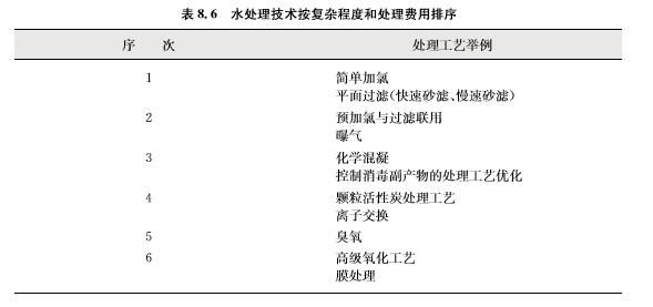 ? 不同水處理工藝按其復(fù)雜程度和處理費(fèi)用的定性排序如表8.6所示,次序越高,工藝或 運(yùn)營越復(fù)雜。