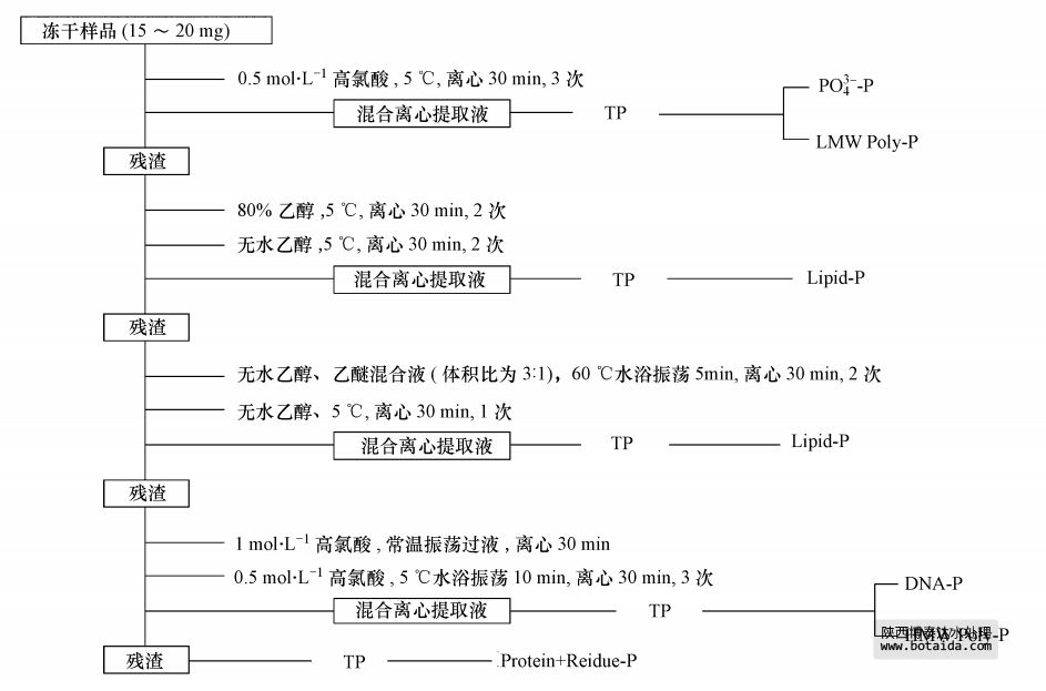 污泥和細(xì)菌細(xì)胞中不同形態(tài)磷含量的測定采用改進的STS法,具體測量步驟見圖 1.該法將樣品中的磷分為正磷酸鹽(PO3-4-P)、低分子量聚磷酸鹽(LMW Poly-P)、磷脂(Lipid-P)、DNA磷(DNA-P)、高分子量聚磷酸鹽(HMW Poly-P)、蛋白質(zhì)磷和殘渣磷(Protein+Residue-P).混合離心提取液中TP含量測定時采用封閉回流消解法預(yù)處理,用鉬銻抗法測定TP和PO3-4-P含量,DNA-P含量由DNA含量乘以系數(shù)9.2%計算得到(磷是DNA的特征元素,含量相對恒定),差減計算得到LMW Poly-P和HMW Poly-P含量.