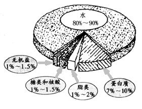 水在細(xì)胞中含量是最多的.在不同種類的生物體中,水的含量差別較大,一般來(lái)說,生物體中水的含量為60%~95%.例如,幼嫩植物體中水的含量約為70%,動(dòng)物體中水的含量約為80%左右,水母的身體里水的含量竟約為97%.