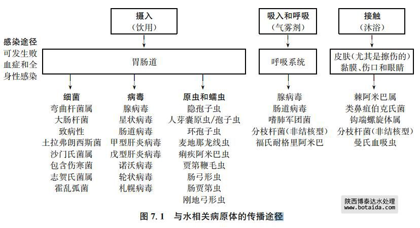 能在自然環(huán)境中存在的其他病原體可能導(dǎo)致那些易感人群引發(fā)疾病,如老人或幼兒、燒 傷或有大面積創(chuàng)傷的病人、接受免疫抑制療法或是獲得性免疫缺陷綜合癥(艾滋病)患者。 如果這些人飲用或沐浴的水中含有足夠數(shù)量的這種病原體,就可引起各種皮膚和眼、耳、鼻、 喉黏膜感染。這些病原包括銅綠假單胞菌、黃桿菌屬、不動桿菌、克雷伯氏菌、沙門氏菌、氣 單胞菌和某些“生長緩慢”的非結(jié)核性分枝桿菌等(見附錄1支持文件《水中的病原分枝桿 菌》)。表7.2列出了一些這種生物體(更多詳細(xì)內(nèi)容請參見第11章)。