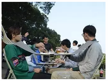 臺(tái)灣就有人發(fā)明了一款吊在脖子上的餐桌,