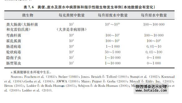 表7.6中,可以清楚地看到糞便指示菌,如大腸桿菌在廢水中常常呈現(xiàn)較高濃度。每個 人都會散布大腸桿菌,但濃度變化很大。只有被感染的人散布病原體,因此,廢水中病原體 濃度變化更大。這樣的變化取決于擴(kuò)散模式,也依賴于其他因素,如排放廢水的人群規(guī)模或 被其他廢水、如工業(yè)廢水稀釋的規(guī)模。傳統(tǒng)廢水處理在廢水被排放到地表水之前,常常降低 一到兩個數(shù)量級的微生物濃度。在其他地方,原水被直接排放,或者通過排水管溢流偶爾排 放。排放廢水被受納水體稀釋,從而減少了病原體數(shù)量,稀釋因子是因地而異。病原體失 活、死亡或進(jìn)入到沉積物里也會使病原體減少。這些因子隨著表面水體和氣候的不同而變 化。這種變化說明糞便指示菌和病原體的濃度在地表水體比廢水中變化更多。