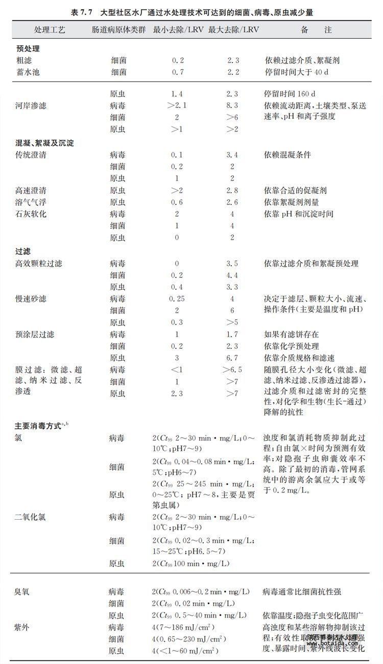 表7.7中列出的微生物降低水平是指微生物的大類群或類別:細(xì)菌、病毒和原蟲。由 于各種微生物本身所固有的特性(如大小、外保護層特性和表面理化性質(zhì)等)不同,因而不同 種類的微生物的處理效果往往存在差異。在這些微生物類群中,處理效果在特定的種、型、 株間差別較小。但這種差別確實存在,表中針對各類群微生物中抵抗力強、存活時間久的病 原體列出了去除的保守估計。若某一微生物類群中不同的病原體在處理后下降值差別較大 時,則在表中單獨列出針對相應(yīng)病原體的處理結(jié)果。