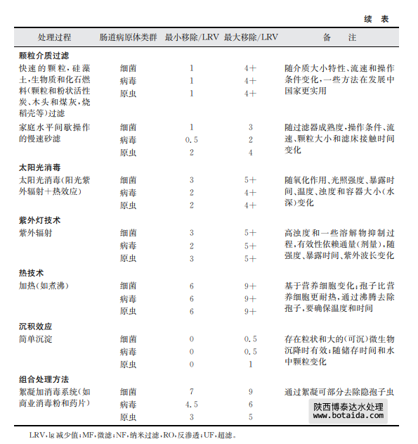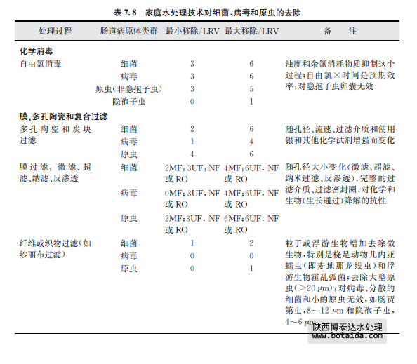 表7.8總結(jié)了采用上述幾種家庭水處理技術(shù)對(duì)水傳播細(xì)菌、病毒和寄生性原生蟲的 去除情況。這些去除信息是基于科學(xué)文獻(xiàn)報(bào)告的研究結(jié)果。有兩個(gè)有效性內(nèi)容:基本去 除和最大去除?;救コ侵赣上鄬?duì)不熟練人員實(shí)際操作時(shí)的一般運(yùn)行效果,且操作人 員將以上方法用于處理平均水質(zhì)或可變水質(zhì)原水及現(xiàn)場(chǎng)只有很少應(yīng)用工具以優(yōu)化處理?xiàng)l 件和操作時(shí)。最大去除是指在熟練操作和優(yōu)化運(yùn)行條件下,并且在可預(yù)見和不變水質(zhì)條 件下,有相關(guān)儀器工具支持并保持最高水平運(yùn)行時(shí)達(dá)到的效果(如測(cè)試一個(gè)已知濃度和種 屬的微生物時(shí))。應(yīng)當(dāng)該注意的是某些水處理工藝的lg減少值存在差異,如表7.8中的 家庭水處理和表7.7中的集中處理。這種相同處理技術(shù)、不同的運(yùn)行效果差異是可以理 解的。因?yàn)榧刑幚硭盟ǔM足處理工藝所需要的質(zhì)量,而且處理過程由訓(xùn)練有素的操作人員使用,工藝經(jīng)過合理的設(shè)計(jì)并有良好的運(yùn)行控制系統(tǒng)。相反,家庭水處理通常 水質(zhì)變化較大,也沒有得到最好的運(yùn)行技術(shù)優(yōu)化。相對(duì)于管理集中處理設(shè)施的人員,處理 過程也常常得不到專業(yè)人員的專業(yè)運(yùn)行控制。這些處理過程的進(jìn)一步細(xì)節(jié),包括運(yùn)行影 響因子和表7.8中提供的lg減少值水平基礎(chǔ),可見附錄1支持性文件《家庭水管理和家庭 水處理選擇評(píng)估》。陜西博泰達(dá)水處理為您提供服務(wù)。