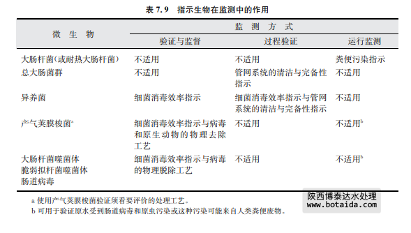 這些標(biāo)準(zhǔn)表明一種設(shè)想,同一種生物可以被同時(shí)用作糞便污染的指示生物,也可以用作 指示處理效率。但是很清楚的是,一種指示生物不能發(fā)揮這兩種功能,針對(duì)不同的目標(biāo),應(yīng) 該考慮不同的生物(見(jiàn)表7.9)。例如,異養(yǎng)菌可以作為消毒效率和管網(wǎng)系統(tǒng)清潔的運(yùn)行指 示,而產(chǎn)氣莢膜梭菌和大腸桿菌噬菌體可以用來(lái)驗(yàn)證處理系統(tǒng)的效率。