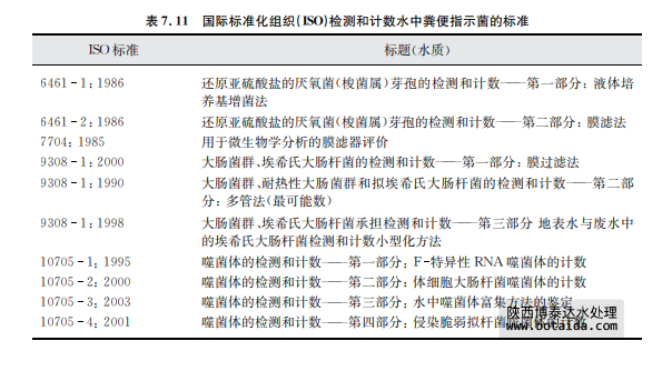 國際標準方法在被采納之前應(yīng)根據(jù)當?shù)氐木唧w情況進行評估。可以使用已建立的標準 方法,如國際標準化組織(ISO)(見表7.11)的方法或效果及可靠性與其相當?shù)姆椒ň刹?用。對于常規(guī)檢測可采用那些已建立的方法。無論選用何種方法檢測埃希氏大腸桿菌或耐 熱性大腸菌群,都必須考慮因環(huán)境或消毒劑受到損傷的微生物菌株的“復(fù)蘇”或“恢復(fù)”問題。