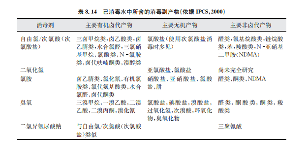 在水處理過程中,有些物質是人為添加進入水體的(直接添加物),有些物質可能不受控 制地殘留在出水中(如鹽類、高分子絮凝劑殘留物或單體)。類似氯胺或自由氯的殘留屬于 有意添加,這些殘留對水質保障有一定好處。其他物質,如消毒副產物,是在消毒劑與水中 通常存在的一些物質相互起化學反應過程中產生的(見表8.14)。氯化消毒副產物和其他消 毒副產物也可能會在游泳池用水中出現(xiàn),此時吸入和皮膚吸收途徑對人體接觸消毒副產物 更加重要(WHO,2006)。