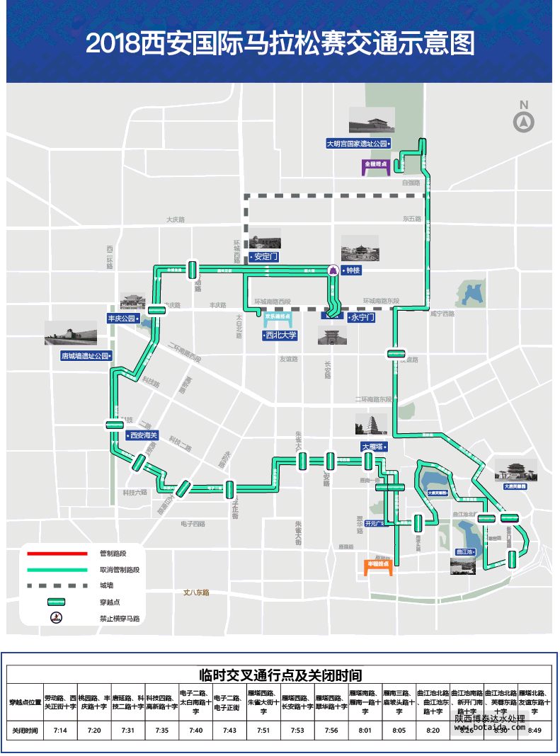 此次西安國(guó)際馬拉松的3項(xiàng)比賽起點(diǎn)均設(shè)在永寧門(mén),為配合大賽舉辦,根據(jù)組委會(huì)要求,比賽當(dāng)日地鐵二號(hào)線永寧門(mén)站將延遲至上午10點(diǎn)開(kāi)站,自地鐵運(yùn)營(yíng)開(kāi)始至10時(shí),列車(chē)在永寧門(mén)站不停站通過(guò),前往永寧門(mén)站的乘客可從相鄰的鐘樓站或南稍門(mén)站進(jìn)出車(chē)站,由此給廣大乘客出行帶來(lái)的不便,請(qǐng)大家給予理解與支持。