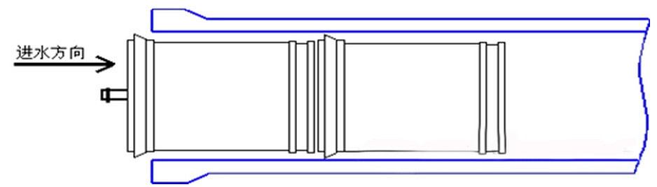 2.4將膜元件不帶鹽水密封圈的一端從壓力容器進(jìn)水端平行地推入膜殼,直到元件露在壓力容器進(jìn)水端外面約10公分左右。見上圖: