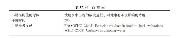 西維因通過抑制腦膽堿酯酶活性發(fā)揮作用,這也是其主要的毒性模式。不過,西維因也 被認(rèn)為是一種小鼠體內(nèi)會引起雄性小鼠血管瘤的非基因毒性致癌物。在此基礎(chǔ)上,JMPR 設(shè)定犃犇犐為0~0.008mg/kgbw,這一犃犇犐通過15mg/kgbw/d的最低損害作用水平 (LOAEL)以及采用安全系數(shù)為2000(種間變異為10,種內(nèi)變異為10,不確定系數(shù)另?。保?用來反映罕見惡性腫瘤的出現(xiàn))計算而得。 假定一個60kg的成年人每天飲用2L水,飲用水的攝入配額假設(shè)為20%,從0~ 0.008mg/kgbw的犃犇犐值可以確定以健康為基準(zhǔn)的準(zhǔn)則值為50μg/L(取整值)。不過,似 乎在飲用水中沒有發(fā)現(xiàn)高濃度西維因,因此認(rèn)為沒有必要提出一個正式的準(zhǔn)則值。